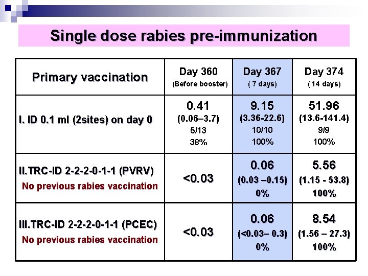 The GMT was 1522 IUml on year 5 plus 14 days. 2일 전People with ongoing high risk of exposure and inadequate titres should be given a booster dose of either rabies vaccine. Intramuscular booster doses of vaccine should be administered to maintain a serum titer corresponding to at least complete neutralization at a 15 serum dilution by the RFFIT.